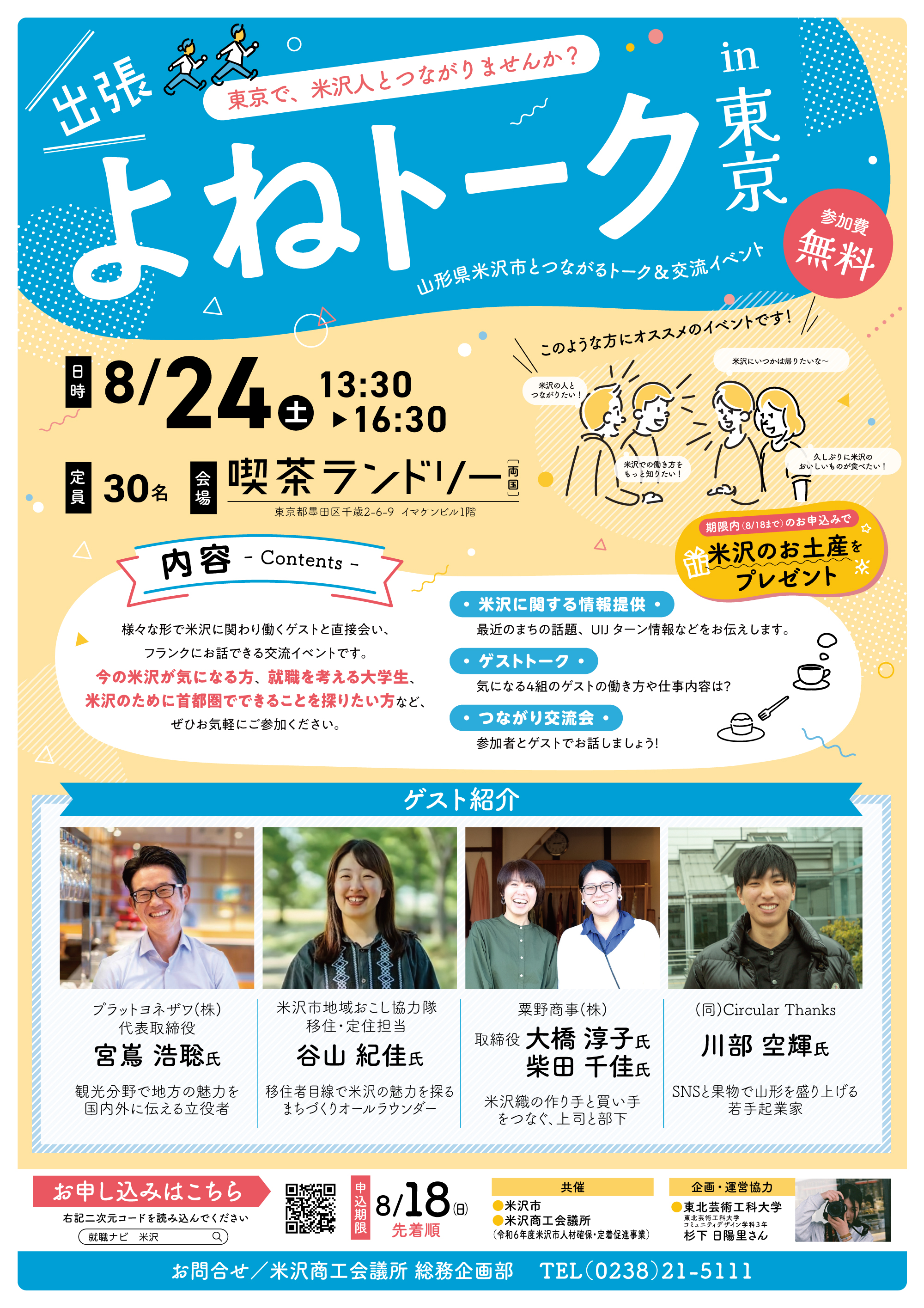 今の米沢が気になる方、就職を考える大学生、米沢のために首都圏でできることを探りたい方など、ぜひお気軽にご参加ください。